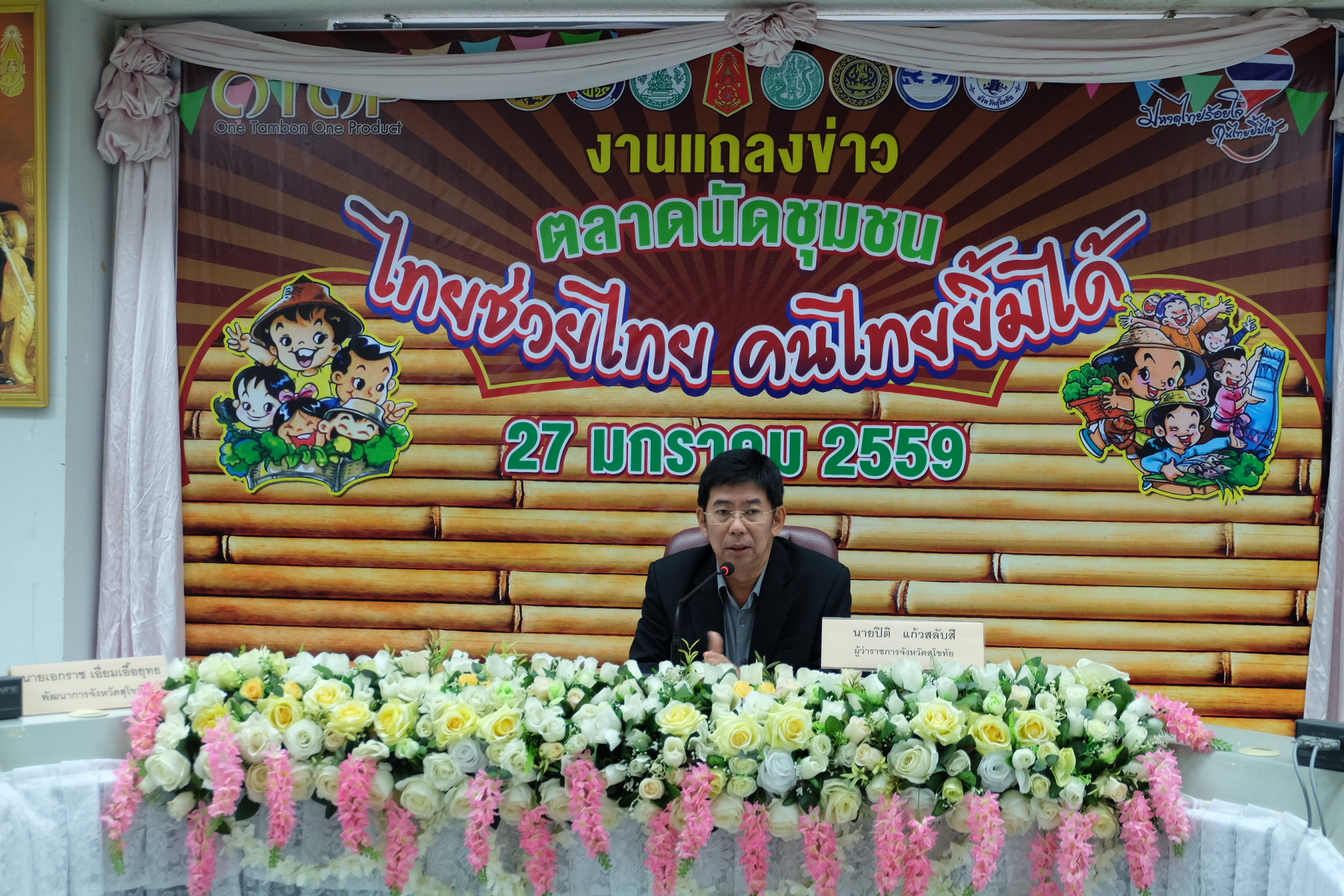 สำนักงานพัฒนาชุมชนจังหวัดสุโขทัย จัดแถลงข่าวการจัดตลาดนัดชุมชน ไทยช่วยไทย คนไทยยิ้มได้ (วิถีชีวิต เศรษฐกิจสุโขทัย) ณ ห้องประชุมศาลากลางจังหวัดสุโขทัย ชั้น 3 โดยมีนายปิติ แก้วสลับสี ผู้ว่าราชการจังหวัดสุโขทัย เป็นประธานแถลงข่าว มีนายเอกราช เอี่ยมเอื้อยุทธ พัฒนาการจังหวัดสุโขทัย กล่าวรายงาน โดยการจัดตลาดนัดชุมชนไทยช่วยไทย คนไทยยิ้มได้ ซึ่งมีการบูรณาการร่วมกับหน่วยงานภาคี อาทิ กองกำลังรักษาความสงบเรียบร้อย กองบัญชาการช่วยรบที่ 3 องค์การบริหารส่วนจังหวัดสุโขทัย พาณิชย์จังหวัดสุโขทัย อุตสาหกรรมจังหวัดสุโขทัย เกษตรและสหกรณ์จังหวัดสุโขทัย เกษตรจังหวัดสุโขทัย สหกรณ์จังหวัดสุโขทัย ท่องเที่ยวและกีฬาจังหวัดสุโขทัย และวัฒนธรรมจังหวัดสุโขทัย กำหนดดำเนินการ จำนวน 10 ครั้ง ครั้งละ 3 วัน โดยกำหนดพิธีเปิดในวันที่ 26 กุมภาพันธ์ 2559 ณ ถนนนิกรเกษม (ริมแม่น้ำยม) หน้าจวนผู้ว่าราชการจังหวัดสุโขทัย เพื่อเป็นการเพิ่มช่องทางการจำหน่ายสินค้า สร้างงาน สร้างอาชีพให้กับประชาชน สนับสนุนและพัฒนาผู้ผลิต ผู้ประกอบการ OTOP ได้เรียนรู้ทักษะการบริหารจัดการตลาด