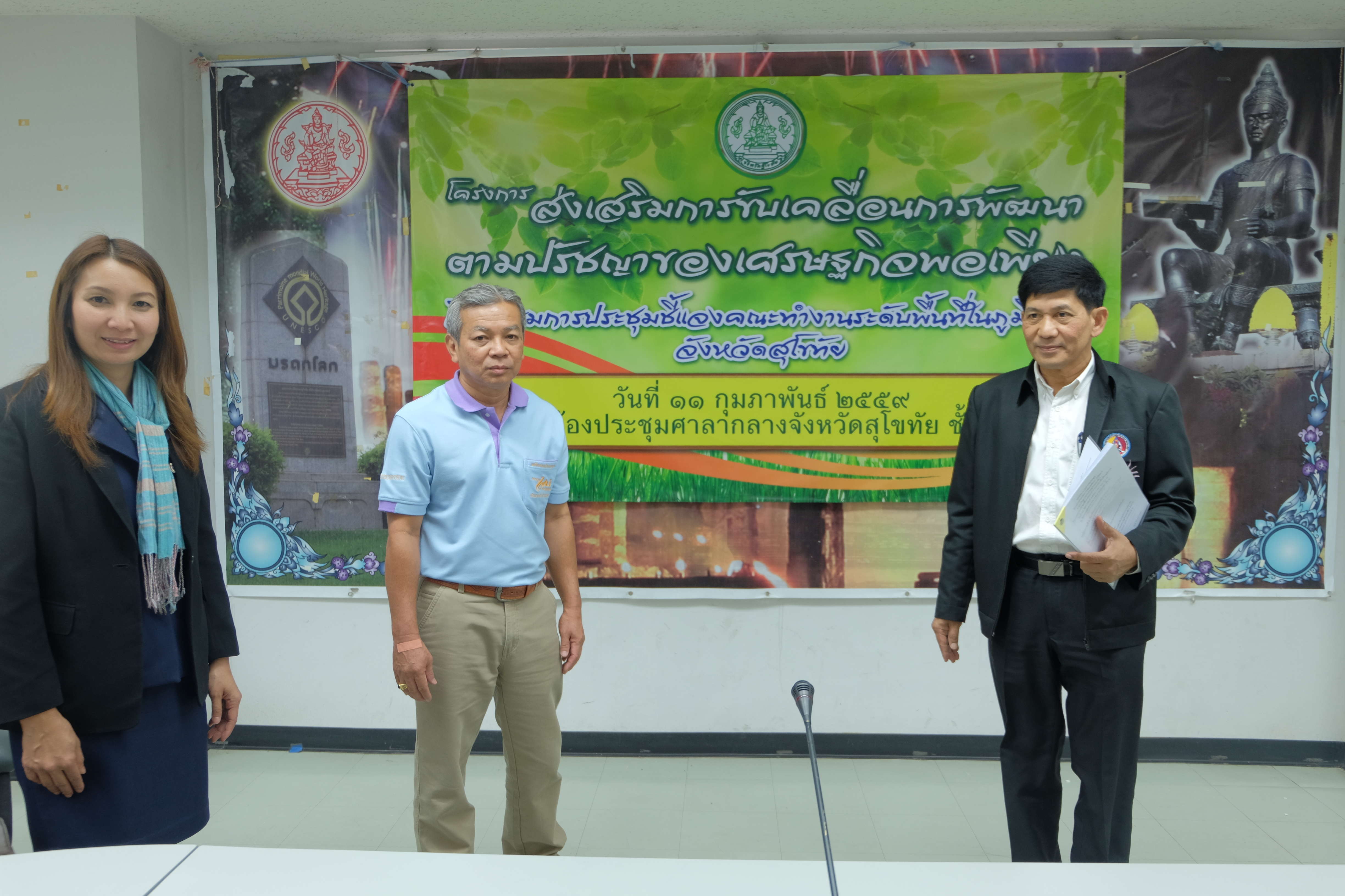 วันที่ 10 ก.พ.59 เวลา 15.00 น. นายสุวิน พึ่งเงิน พัฒนาการจังหวัดสุโขทัย และนายประนทต์ ปัจฉิม หัวหน้ากลุ่มงานส่งเสริมฯ ตรวจติดตามความพร้อมสถานที่จัดประชุมโครงการส่งเสริมการขับเคลื่อนการพัฒนาตามปรัชญาเศรษฐกิจพอเพียง กิจกรรมการประชุมชี้แจงคณะทำงานระดับพื้นที่ในภูมิภาค ณ ห้องประชุมชั้น 4 ศาลากลางจังหวัดสุโขทัย ปรากฎว่ามีความพร้อมครบถ้วนสมบูรณ์สามารถดำเนินการได้เป็นอย่างดี และสำนักงานพัฒนาชุมชนจังหวัดสุโขทัยได้สั่งกำชับให้ พอ.เน้นย้ำทำความเข้าใจกับคณะทำงานระดับอำเภอ/ตำบล และแกนนำหมู่บ้านในการจัดเก็บข้อมูลบัญชีรับจ่ายครัวเรือน ข้อมูลแหล่งน้ำและข้อมูลเศรษฐกิจสังคมให้ชัดเจน ถูกต้อง เพื่อจะได้นำไปใช้เป็นฐานในการวิเคราะห์ในการจัดเวทีประชาคม ครั้งที่ 1 และ 2 ได้อย่างมีประสิทธิภาพต่อไป