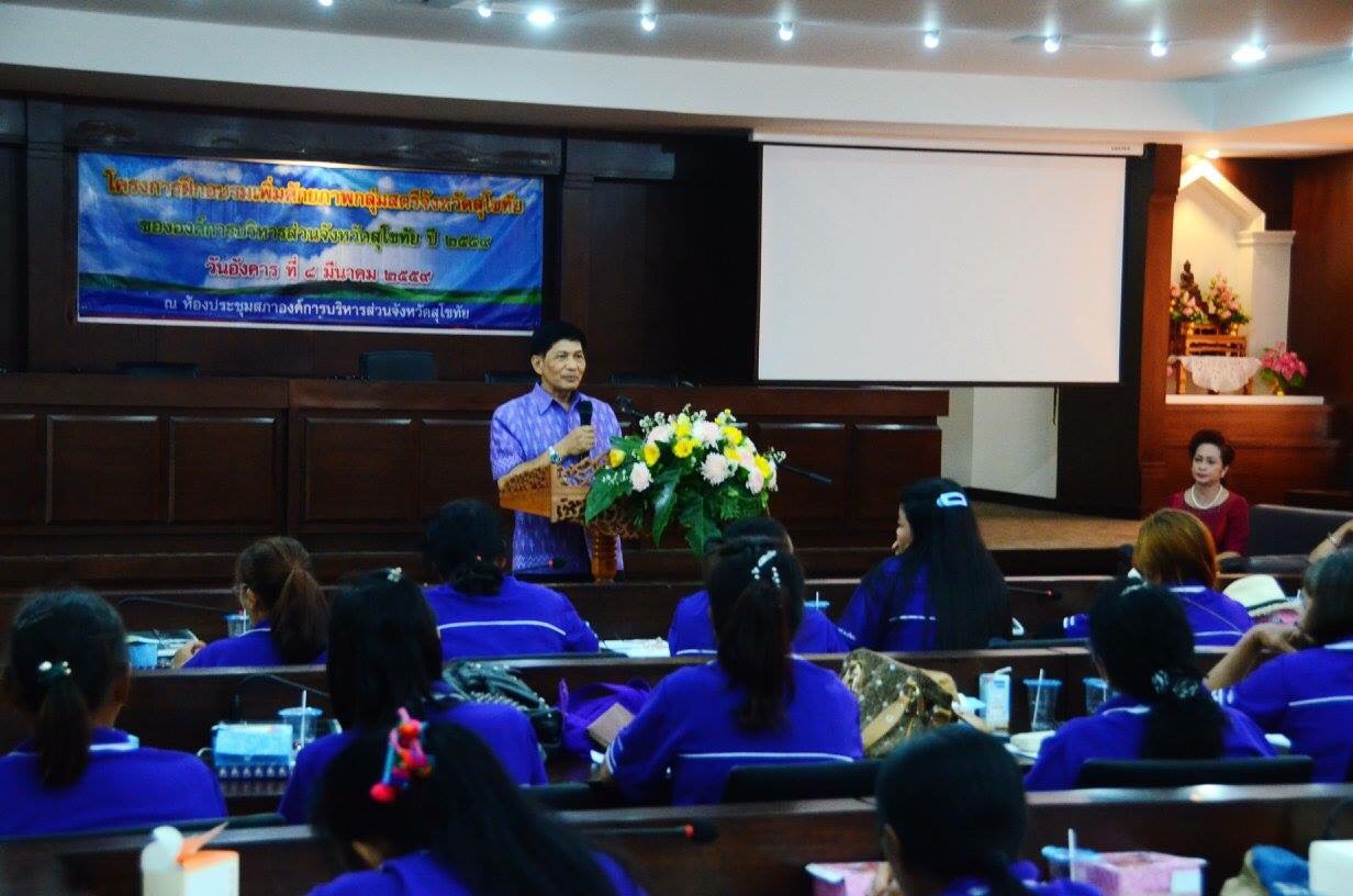 นายสุวิน พึ่งเงิน พัฒนาการจังหวัดสุโขทัย ร่วมพิธีเปิดโครงการฝึกอบรมเพิ่มศักยภาพกลุ่มสตรีจังหวัดสุโขทัย และบรรยายพิเศษเรื่อง “บทบาทหน้าที่ผู้นำสตรีกับการพัฒนาท้องถิ่นของตนเอง” โดย ดร.พรรณสิริ กุลนาถศิริ นายก อบจ.สุโขทัย เป็นประธานเปิดโครงการ เพื่อให้ความรู้ เสริมสร้างศักยภาพในการพัฒนาตนเองของผู้นำสตรี สร้างความเชื่อมั่นในการแก้ไขปัญหาให้กับชุมชนและสังคม มีคณะกรรมการกองทุนพัฒนาบทบาทสตรี เข้าร่วมโครงการ 300 คน ณ องค์การบริหารส่วนจังหวัดสุโขทัย