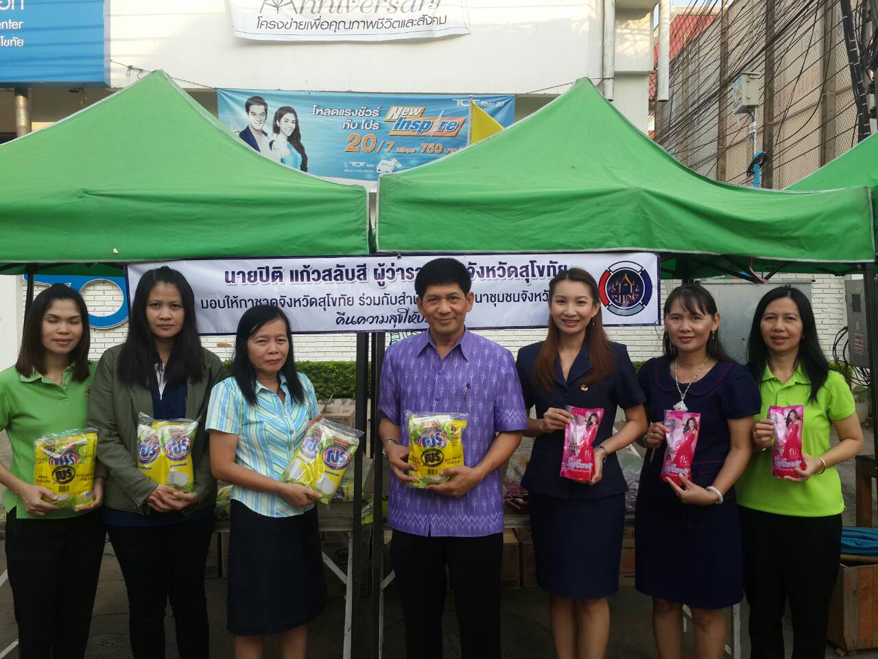นายสุวิน พึ่งเงิน พัฒนาการจังหวัดสุโขทัย เยี่ยมชมให้กำลังใจผู้ผลิต ผู้ประกอบการ พ่อค้า แม่ค้าที่นำสินค้ามาจำหน่ายในตลาดนัดชุมชน ไทยช่วยไทย คนไทยยิ้มได้ บริเวณข้างธนาคารเพื่อการเกษตรและสหกรณ์การเกษตร สาขาสุโขทัย