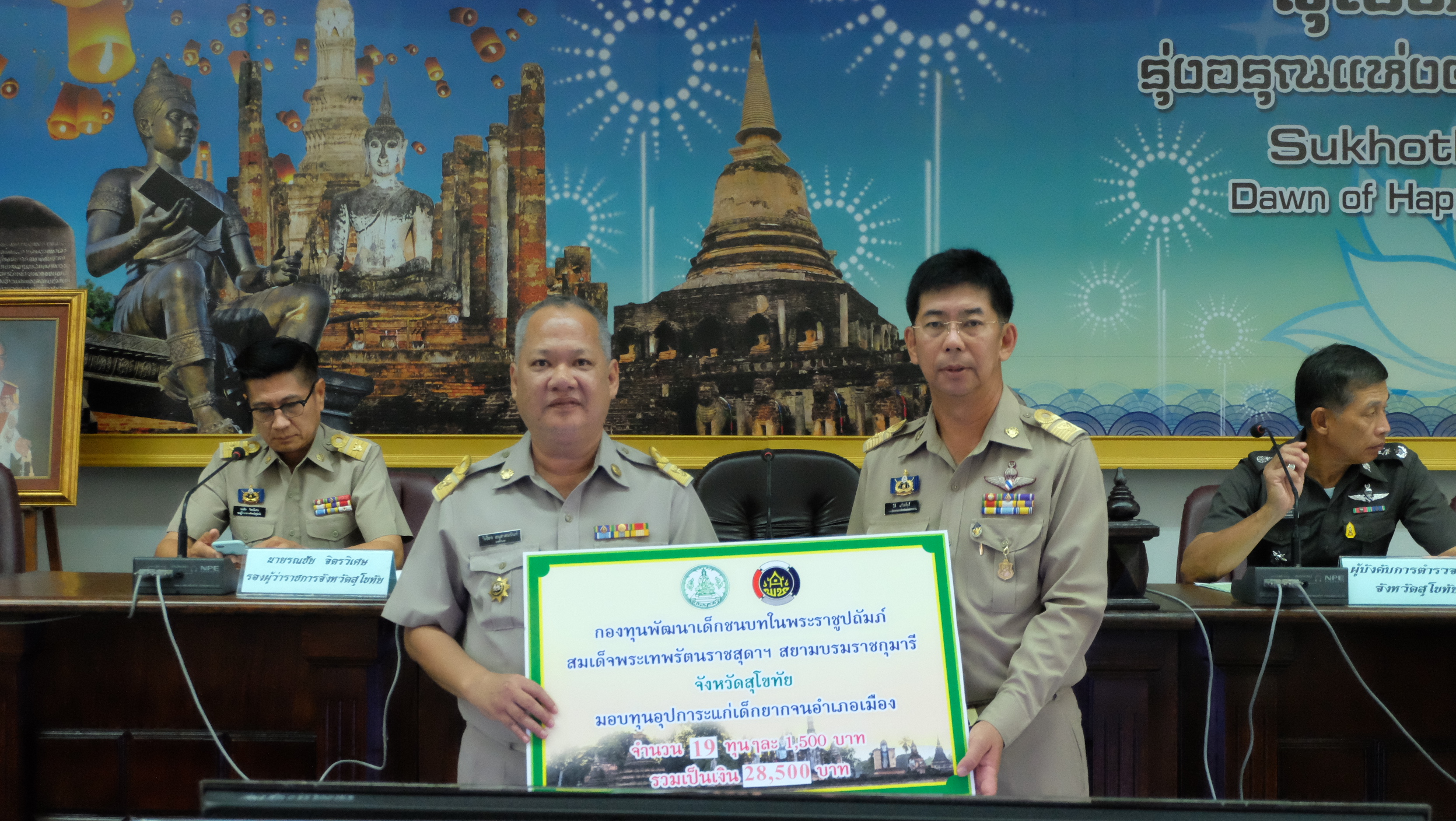 #สุโขทัย ดินแดนแห่งความสุข# มอบทุนอุปการะเด็กกองทุนพัฒนาเด็กชนบท ในพระราชูปถัมภ์สมเด็จพระเทพรัตนราชสุดาฯ สยามบรมราชกุมารี ให้กับนายอำเภอทุกอำเภอ เพื่อนำไปมอบเป็นทุนช่วยเหลือเด็กยากจนและด้อยโอกาสของแต่ละอำเภอ จำนวน 136 ทุน ทุนละ 1,500 บาท รวมเป็นเงิน 204,