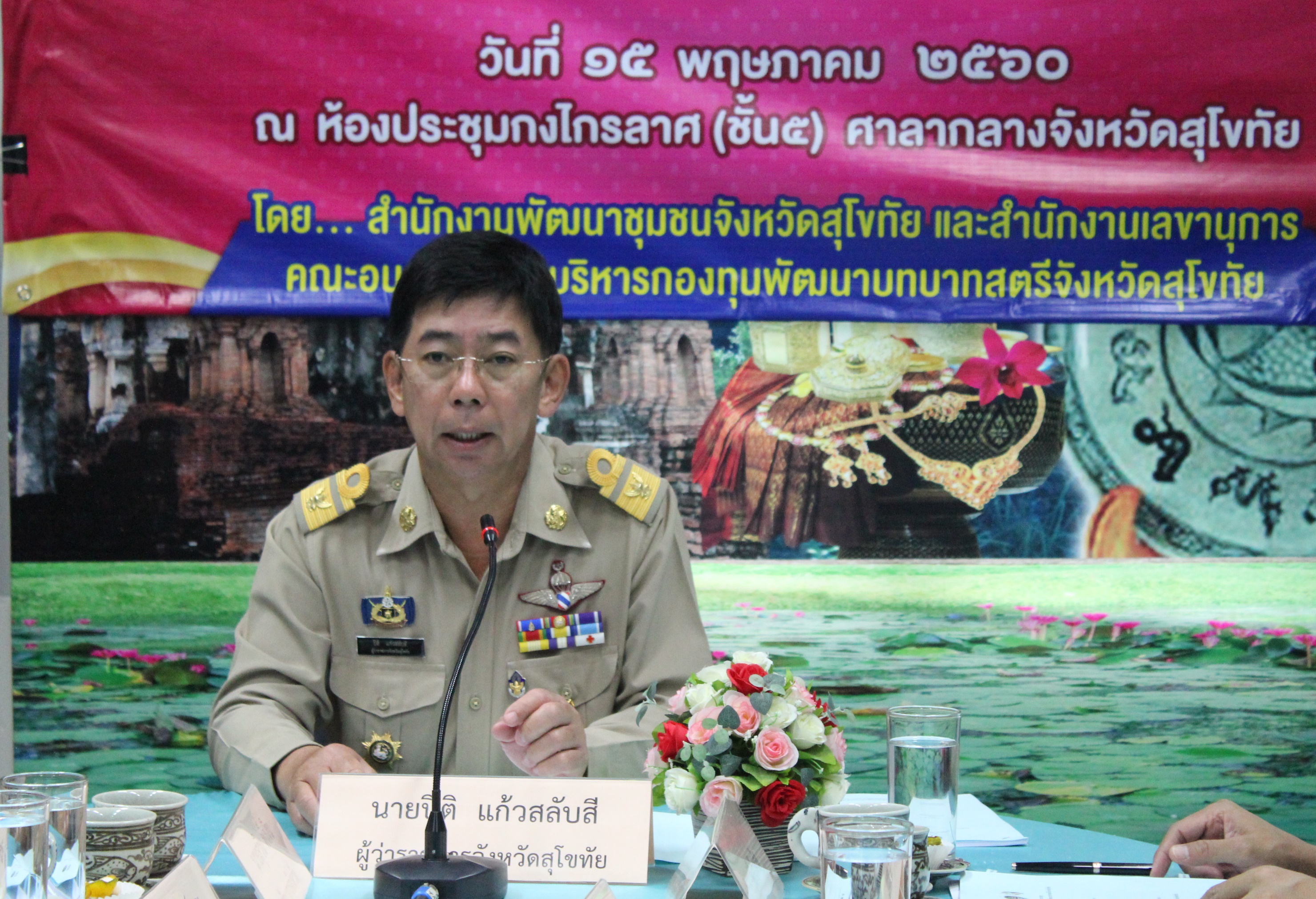 วันที่ 15 พฤษภาคม 2560 เวลา 09.00 น. ณ ห้องประชุมสำนักงานพัฒนาชุมชนจังหวัดสุโขทัย นายปิติ แก้วสลับสี ผู้ว่าราชการจังหวัดสุโขทัย เป็นประธานการประชุมคณะอนุกรรมการบริหารกองทุนพัฒนาบทบาทสตรีจังหวัดสุโขทัย ครั้งที่ 3/2560 โดยมีนายสุวิน พึ่งเงิน พัฒนาการจังหวัดสุโขทัย รายงานผลการดำเนินงานกองทุนพัฒนาบทบาทสตรีจังหวัดสุโขทัย และได้มีการพิจารณาขอคำแนะนำในการติดตามการชำระคืนเงินกองทุนพัฒนาบทบาทสตรีจังหวัดสุโขทัย (กรณีที่กลุ่มสมาชิกเลยกำหนดชำระคืนเงิน) ของตำบลท่าฉนวน อำเภอกงไกรลาศ จังหวัดสุโขทัย
