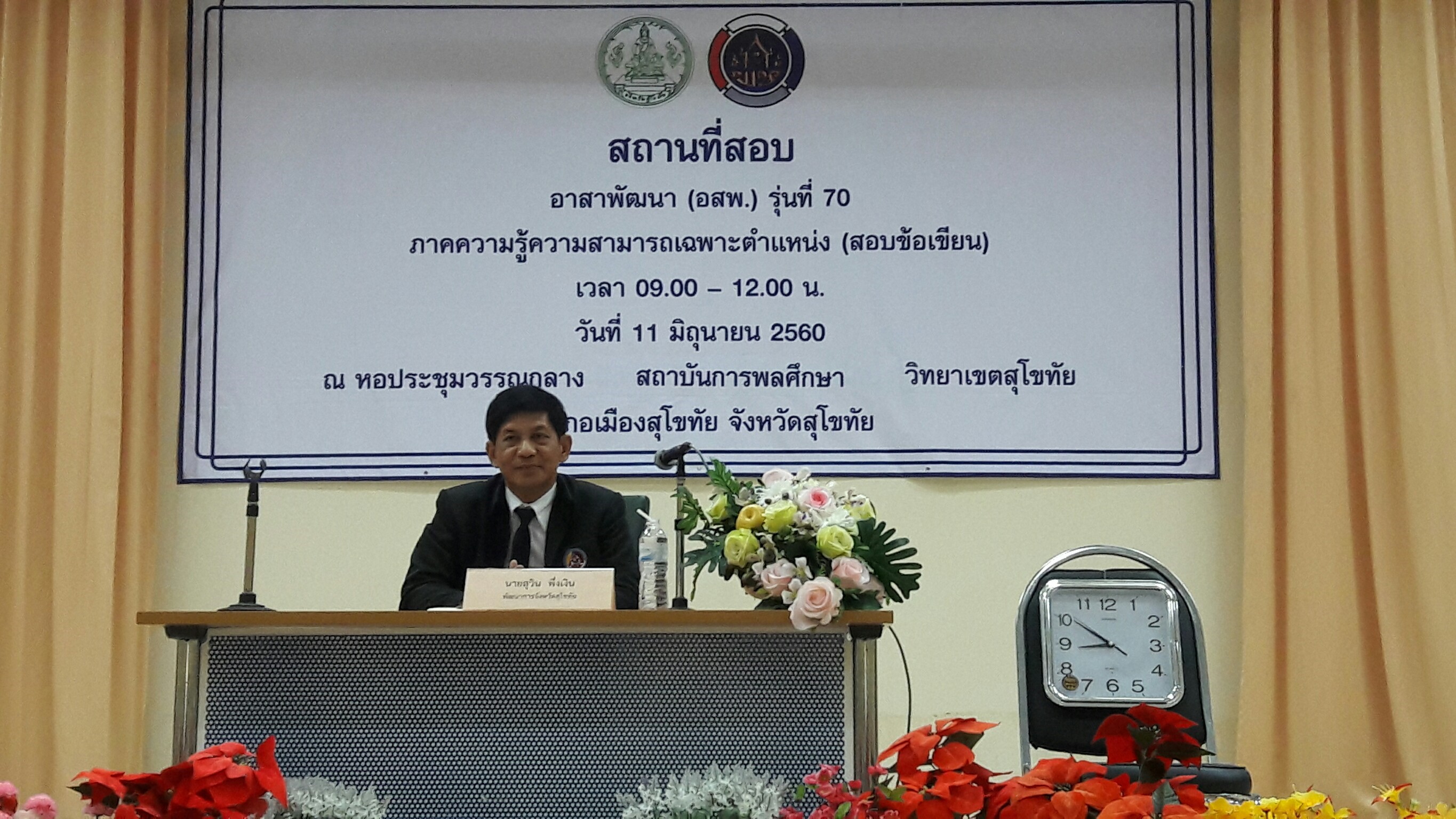 โดย นายสุวิน พึ่งเงิน พัฒนาการจังหวัดสุโขทัย เป็นประธานคณะกรรมการอำนวยการสอบ ปฐมนิเทศชี้แจงวัตถุประสงค์ และข้อปฎิบัติในการสอบ พร้อมทั้งให้กำลังใจแก่ผู้เข้าสอบ