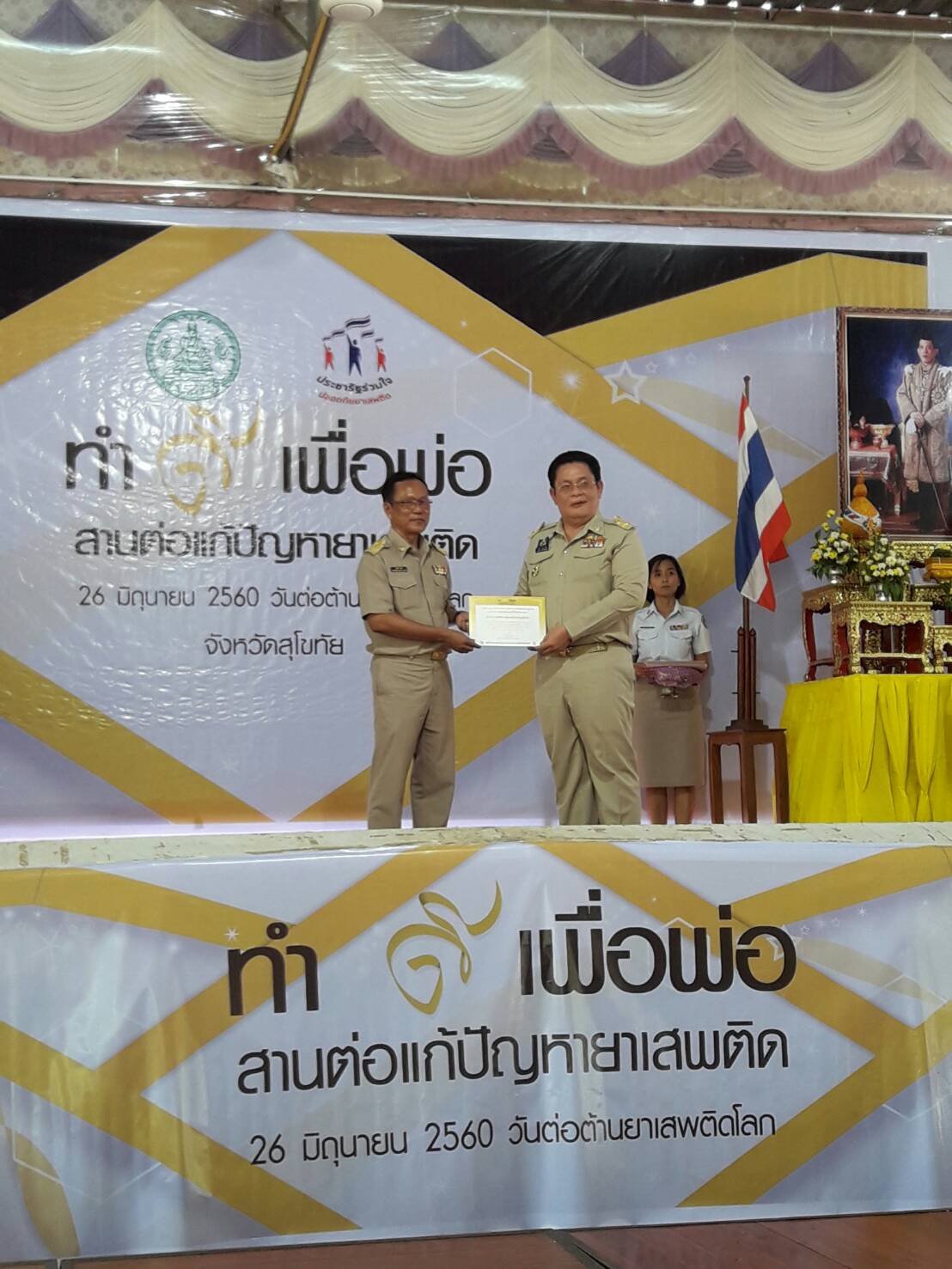 ซึ่งในงานนี้ สำนักงานพัฒนาชุมชนจังหวัดสุโขทัย โดยนายสุวิน พึ่งเงิน พัฒนาการจังหวัดสุโขทัย มอบหมายนายมาโนช สดใส หัวหน้ากลุ่มงานยุทธศาสตร์ฯ ร่วมรับใบประกาศหน่วยงานสนับสนุนด้านป้องกันและแก้ไขปัญหายาเสพติด และนายสมาน พลอยท้วม ประธานกองทุนแม่ของแผ่นดิน บ้านซ่าน ร่วมรับใบประกาศบุคคลดีเด่นด้านการป้องกันยาเสพติด ณ โรงเรียนสุโขทัยวิทยาคม อำเภอเมืองสุโขทัย จังหวัดสุโขทัย