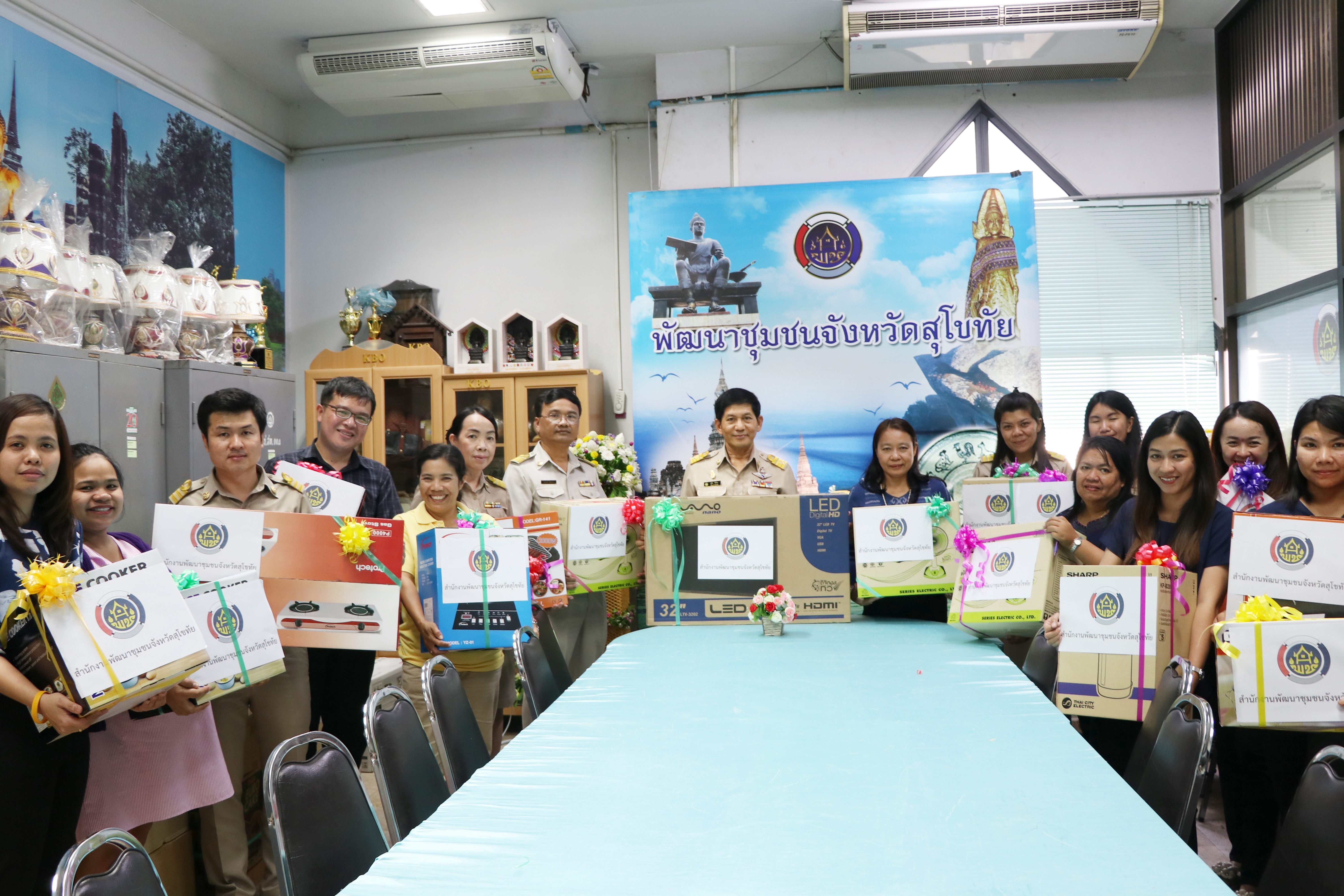 วันที่ 21 มกราคม 2562  สำนักงานพัฒนาชุมชนจังหวัดสุโขทัย นำโดยนายสุวิน พึ่งเงิน พัฒนาการจังหวัดสุโขทัย ร่วมกับสำนักงานพัฒนาชุมชน ทั้ง 9 อำเภอ ร่วมบริจาคของรางวัลเพื่อใช้ในการออกรางวัลงาน “สักการะพระแม่ย่าและงานกาชาดจังหวัดสุโขทัย” ประจำปี 2562 อาทิ เช่น ทีวี หม้อหุงข้าว พัดลม เครื่องปิ้งย่าง และอื่นอีกมากมาย โดยงานกาชาดจังหวัดสุโขทัย จัดขึ้นระหว่างวันที่ 8 – 17 กุมภาพันธ์ 2562 นี้