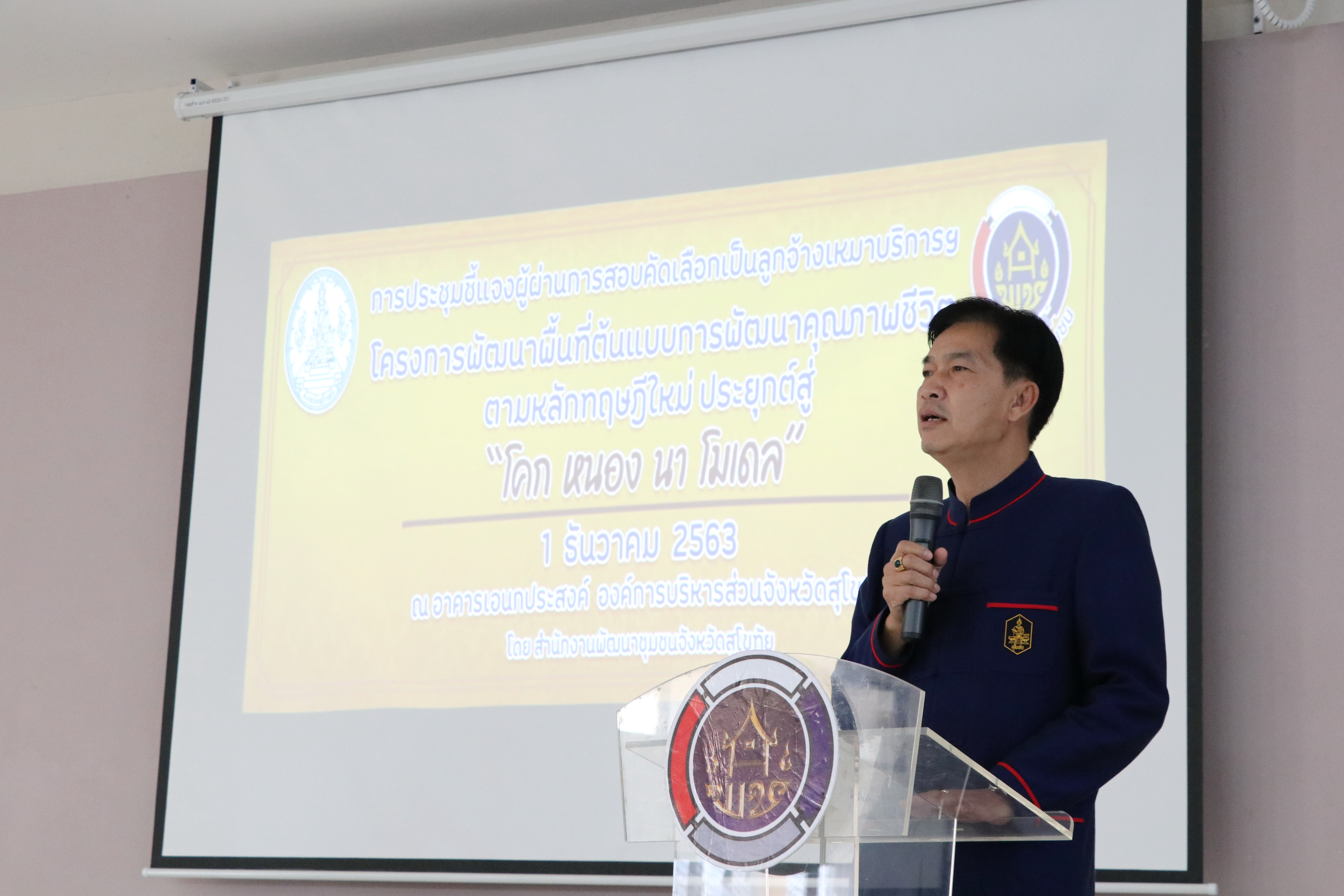 วันที่ 1 ธันวาคม ๒๕๖๓ เวลา 13.30 น. นายธวัช ใสสม พัฒนาการจังหวัดสุโขทัย เป็นประธานการดำเนินกิจกรรมการปฐมนิเทศ และจัดทำบันทึกข้อตกลงการจ้างงาน (รอบบ่าย ช่วงที่ 2 กลุ่มเป้าหมาย จำนวน 4 อำเภอ) ผู้ผ่านการคัดเลือกบุคคลเพื่อจัดจ้างเป็นลูกจ้างเหมาบริการปฏิบัติภารกิจตามโครงการพัฒนาพื้นที่ต้นแบบการพัฒนาคุณภาพชีวิตตามหลักทฤษฎีใหม่ ประยุกต์สู่ “โคก หนอง นา โมเดล” เพื่อชี้แจงรายละเอียดเกี่ยวกับระเบียบ กฎเกณฑ์ แนวทางการปฏิบัติงานในพื้นที่ และภารกิจต่างๆที่จะมอบหมายให้กับผู้ผ่านการคัดเลือกฯ ได้นำไปปฏิบัติในพื้นที่ “โคกหนอง นา โมเดล” ที่ตนเองได้สมัคร และสอบผ่านการคัดเลือกฯ ในพื้นที่แต่ละแห่งของจังหวัดสุโขทัย