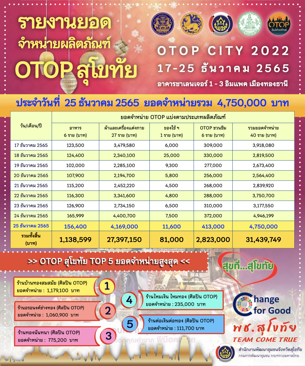 ยอดจำหน่ายผลิตภัณฑ์และสินค้าโอทอปจากจังหวัดสุโขทัยภายในงาน OTOP CITY 2022 มีรายละเอียดดังนี้…