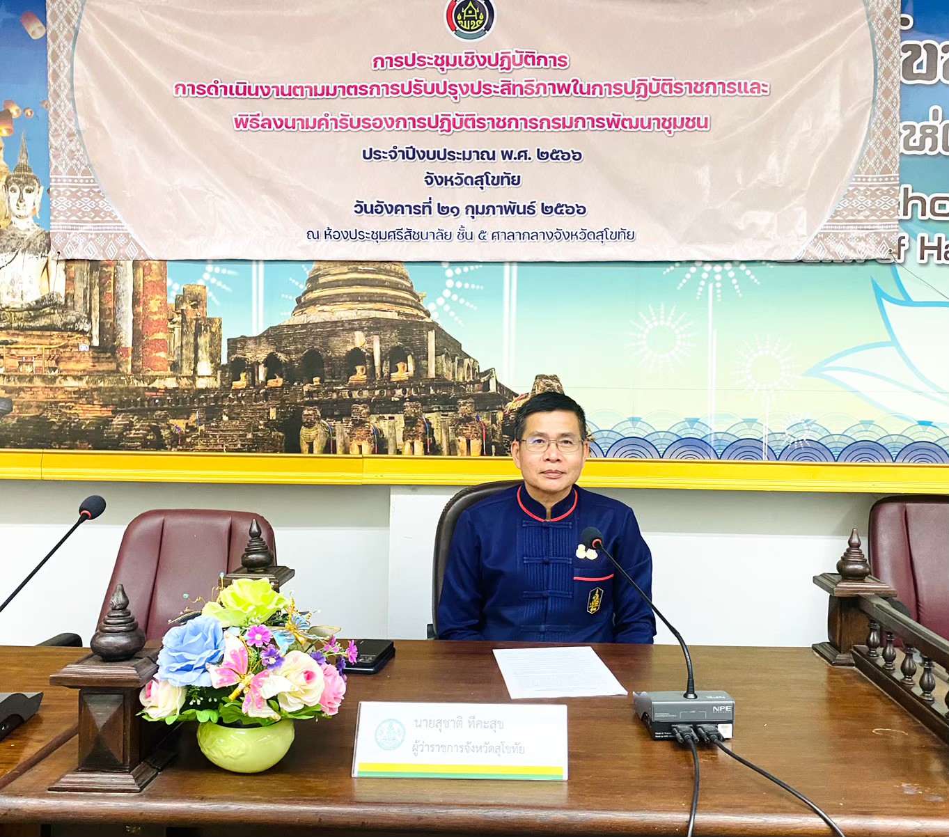 วันที่ 21 กุมภาพันธ์ 2566 เวลา 09.00 น. นายสุชาติ ทีคะสุข ผู้ว่าราชการจังหวัดสุโขทัย ให้เกียรติเป็นประธานการประชุมเชิงปฏิบัติการการดำเนินงานตามมาตรการปรับปรุงประสิทธิภาพในการปฏิบัติราชการและการลงนามคำรับรองการปฏิบัติราชการ ของกรมการพัฒนาชุมชน ประจำปีงบประมาณ พ.ศ. 2566 และมอบแนวทางการดำเนินงานการแก้ไขปัญหาความยากจน ตามแนวทางหมู่บ้านรุ่งอรุณแห่งความสุขอย่างยั่งยืนฯ โดยมีนายธวัช ใสสม พัฒนาการจังหวัดสุโขทัย กล่าววัตถุประสงค์การจัดโครงการฯต่อท่านประธาน พร้อมด้วยผู้อำนวยการกลุ่มงานทุกกลุ่มงาน พัฒนาการอำเภอทั้ง 9 อำเภอ และข้าราชการ เจ้าหน้าที่ในสังกัดสำนักงานพัฒนาชุมชนจังหวัดสุโขทัยและสำนักงานพัฒนาชุมชนอำเภอทุกอำเภอเข้าร่วมการประชุม จำนวน 70 คน โดยมีวัตถุประสงค์เพื่อให้การบริหารราชการเป็นไปเพื่อประโยชน์สุขของประชาชน เกิดผลสัมฤทธิ์ และมีความคุ้มค่าในเชิงภารกิจ การบริหารราชการเป็นไปอย่างมีประสิทธิภาพ สามารถตอบสนองความต้องการของประชาชน