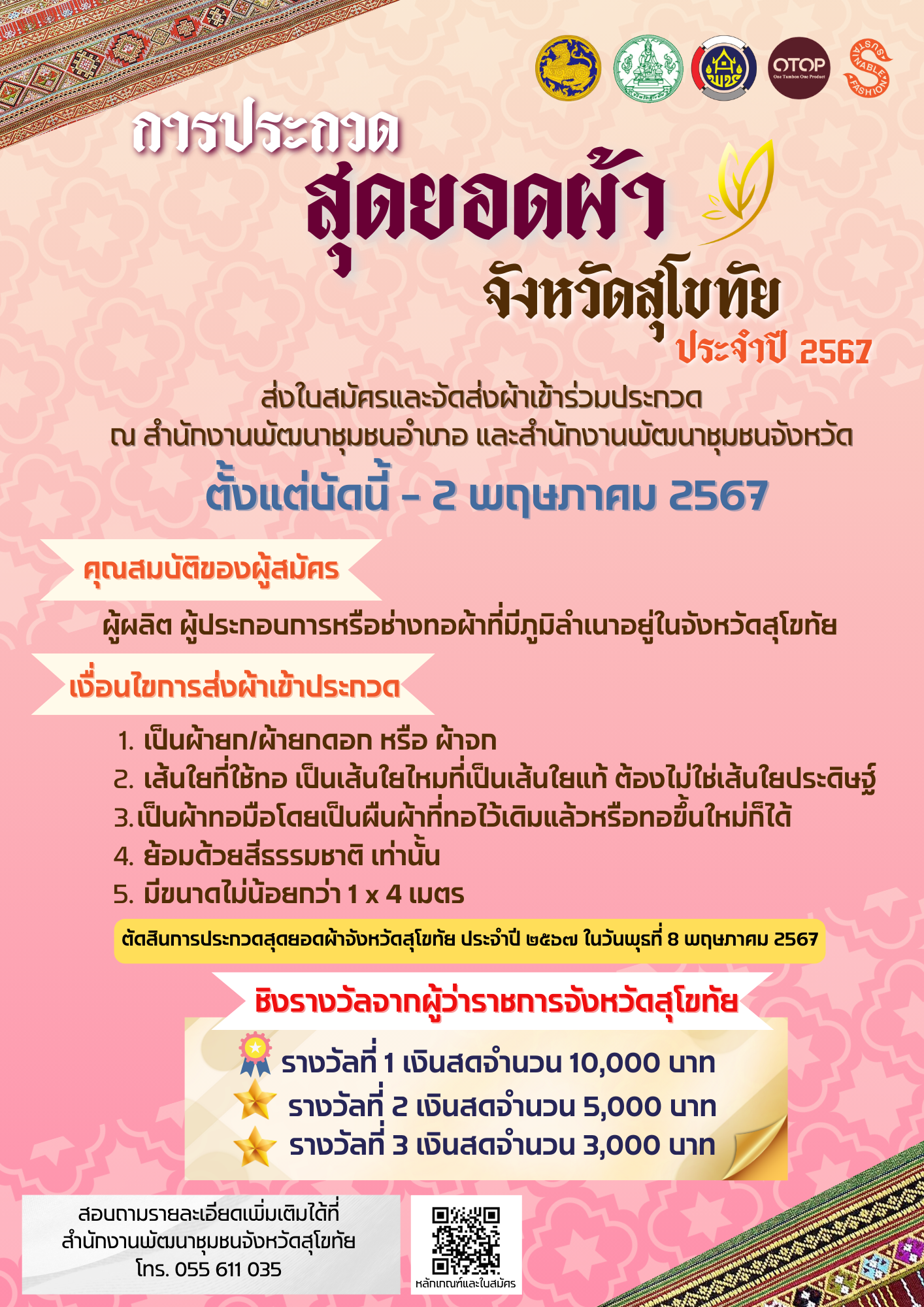 🎆จังหวัดสุโขทัย ขอเชิญชวนช่างทอผ้าในพื้นที่จังหวัดสุโขทัย สมัครเข้าร่วมประกวดสุดยอดผ้าจังหวัดสุโขทัย ประจำปี 2567