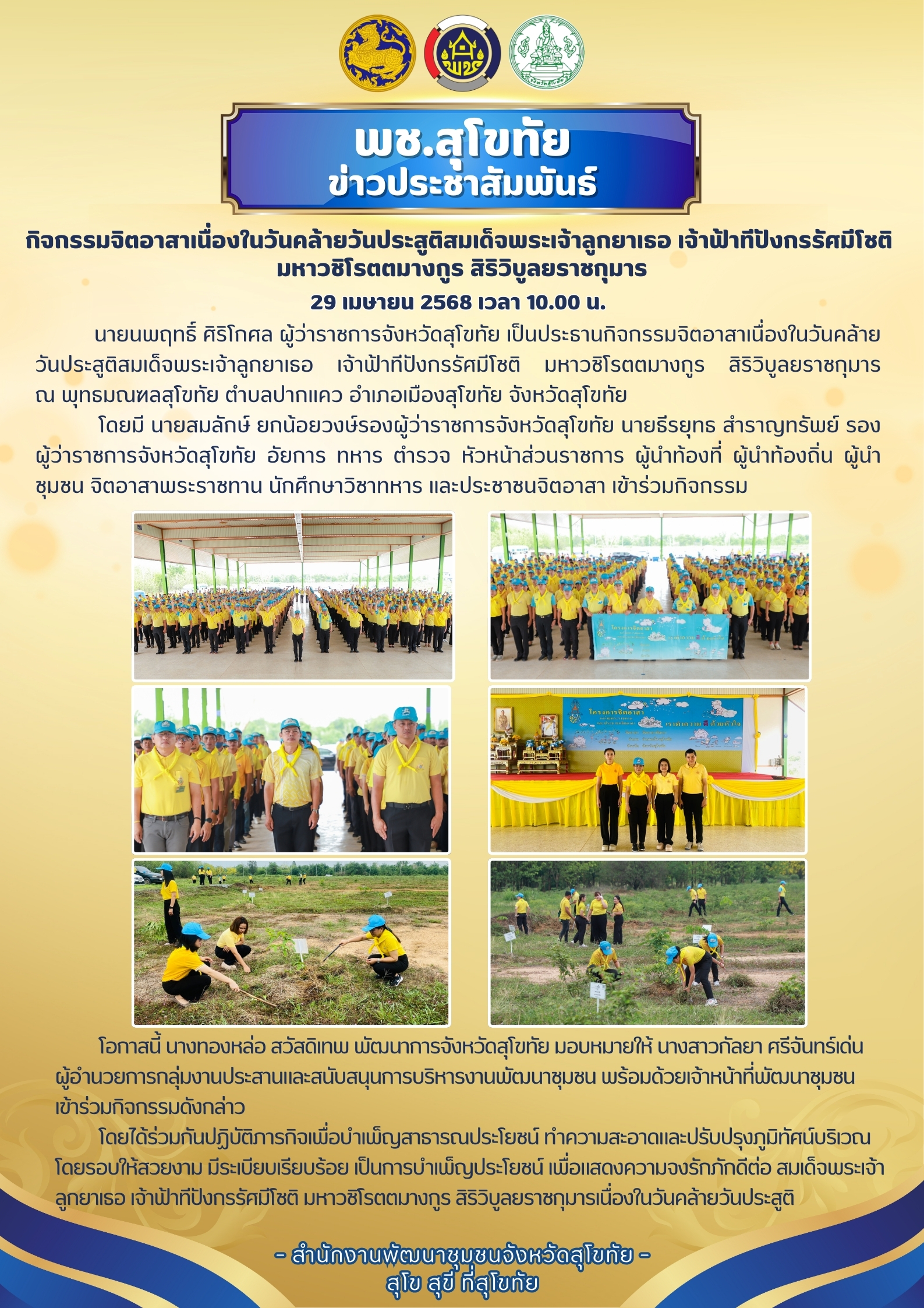 จังหวัดสุโขทัยจัดกิจกรรมจิตอาสาเนื่องในวันคล้ายวันประสูติสมเด็จพระเจ้าลูกยาเธอ เจ้าฟ้าทีปังกรรัศมีโชติ มหาวชิโรตตมางกูร สิริวิบูลยราชกุมาร
