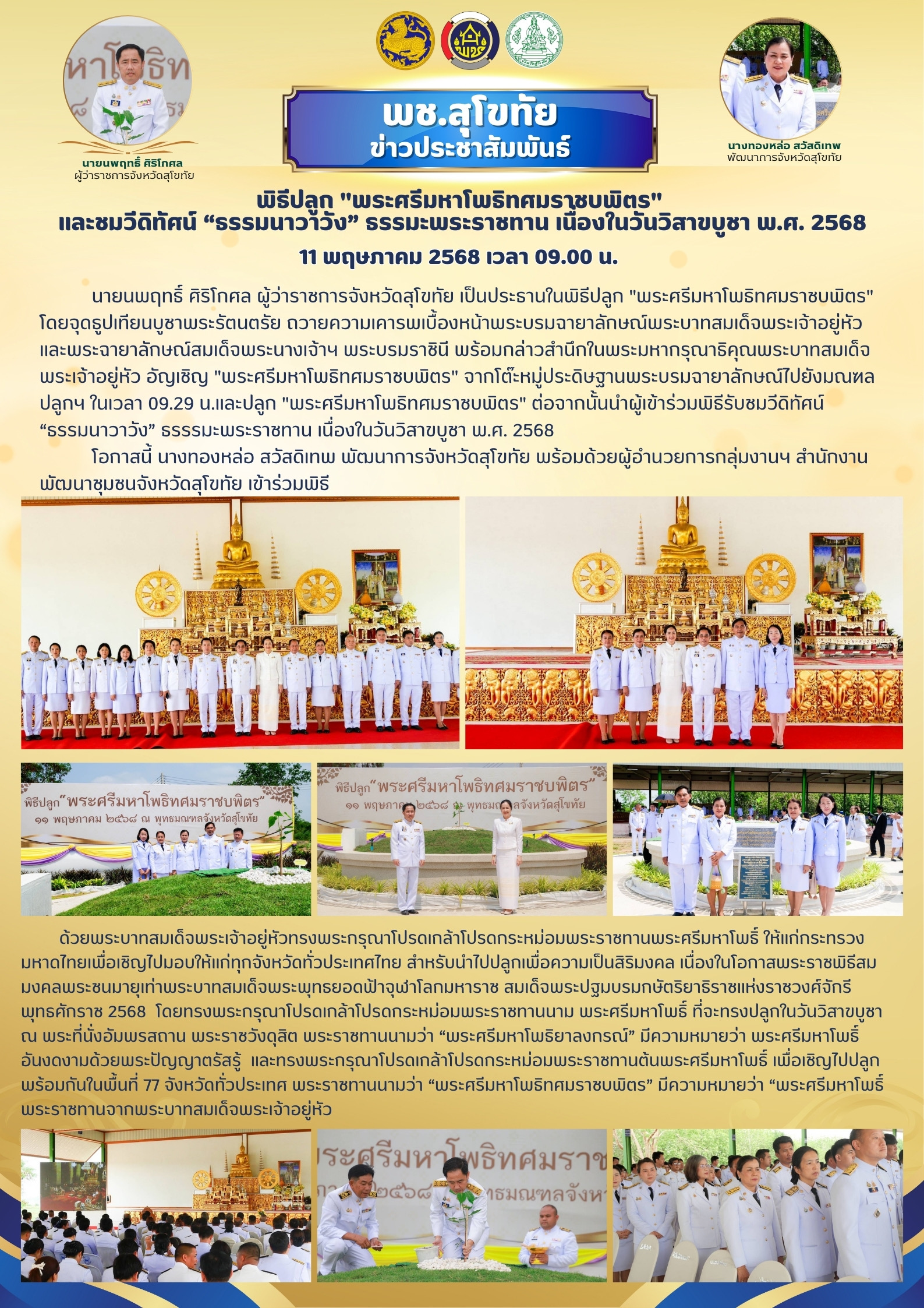 จังหวัดสุโขทัยจัดพิธีปลูก “พระศรีมหาโพธิทศมราชบพิตร” และชมวีดิทัศน์ “ธรรมนาวาวัง” ธรรมะพระราชทาน เนื่องในวันวิสาขบูชา พ.ศ. 2568
