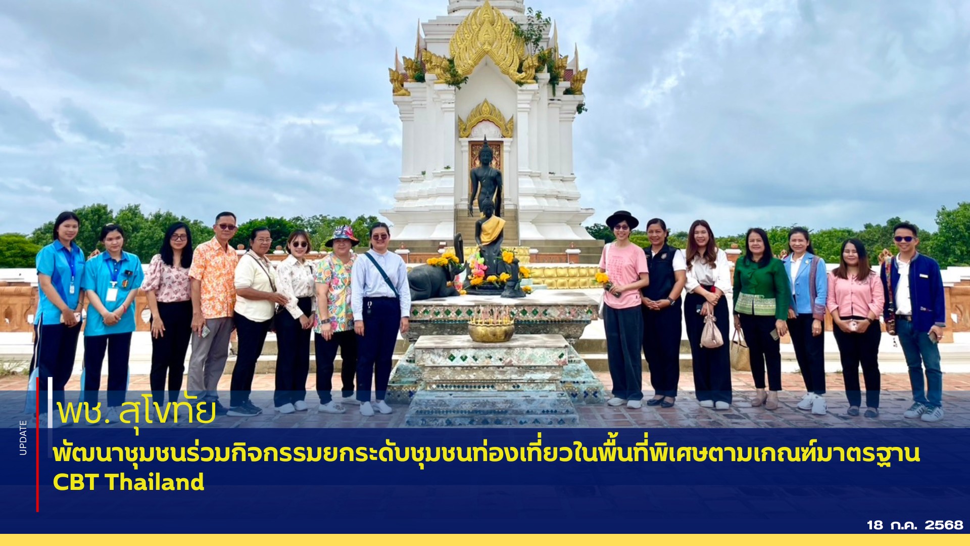 นางทองหล่อ สวัสดิเทพ พัฒนาการจังหวัดสุโขทัย มอบหมายให้ นางกัญญา จิตงามขำ ผู้อำนวยการกลุ่มงานส่งเสริมการพัฒนาชุมชน เข้าร่วมกิจกรรมยกระดับชุมชนท่องเที่ยวในพื้นที่พิเศษตามเกณฑ์มาตรฐาน CBT Thailand ซึ่งจัดโดยองค์การบริหารการพัฒนาพื้นที่พิเศษเพื่อการท่องเที่ยวอย่างยั่งยืน (องค์การมหาชน) โดยสำนักงานพื้นที่พิเศษเพื่อการท่องเที่ยวอย่างยั่งยืนอุทยานประวัติศาสตร์สุโขทัย-ศรีสัชนาลัย-กำแพงเพชร (อพท.สุโขทัย) โดยมีวัตถุประสงค์เพื่อยกระดับชุมชนท่องเที่ยวในพื้นที่พิเศษตามเกณฑ์มาตรฐาน CBT Thailand โดยมีกิจกรรม ดังนี้