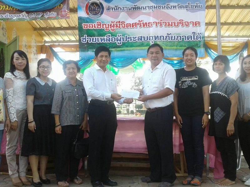 #สุโขทัย ดินแดนแห่งความสุข #วันที่ 15 มกราคม 2560 เวลา 10.30 น. นายอลงกต สุขเกตุ นักวิชาการพัฒนาชุมชนชำนาญการ เป็นผู้แทนจนท.พช.จังหวัดสุโขทัยได้มอบเงินช่วยเหลือผู้ประสบอุทกภัยภาคใต้โดยมีนายสุวิน พึ่งเงิน พัฒนาการจังหวัดสุโขทัย รับมอบ ณ บริเวณศา