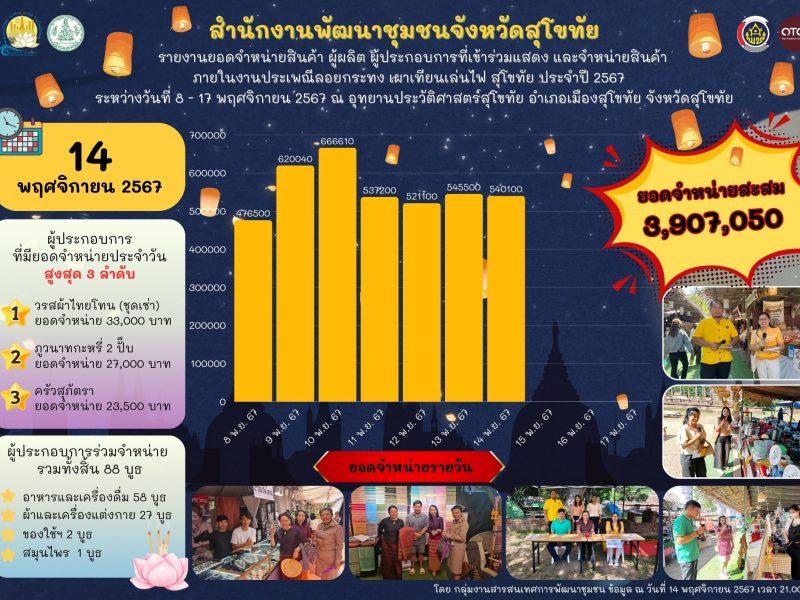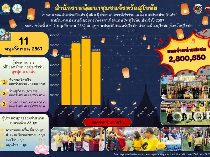 รายงานยอดจำหน่ายสินค้า OTOP ในงานประเพณีลอยกระทง เผาเทียนเล่นไฟ สุโขทัย ประจำปี 2567 ระหว่างวันที่ 8 – 17 พฤศจิกายน 2567 ณ อุทยานประวัติศาสตร์สุโขทัย อำเภอเมืองสุโขทัย จังหวัดสุโขทัย 💥