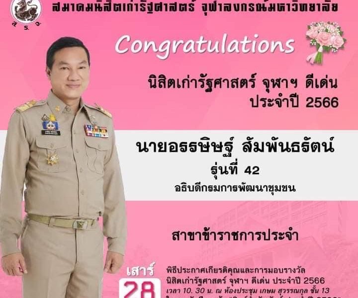 สพจ.สุโขทัย ขอแสดงความยินดีกับท่านอรรษิษฐ์ สัมพันธรัตน์ อธิบดีกรมการพัฒนาชุมชน เนื่องในโอกาสได้รับรางวัลนิสิตเก่า รัฐศาสตร์ จุฬาฯดีเด่น ประจำปี 2566