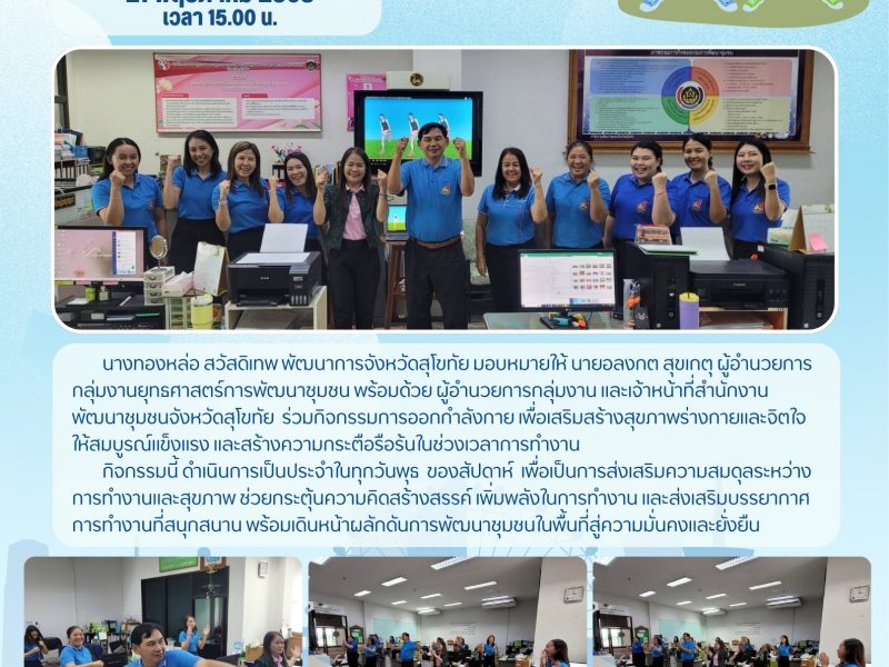 พัฒนาชุมชนสุโขทัยจัดกิจกรรมออกกำลังกาย “สุขภาพดี มีพลัง ด้วยการออกกำลังกาย” ภายใต้โครงการ “(five)P CDD สุโข : องค์กรแห่งความสุข”