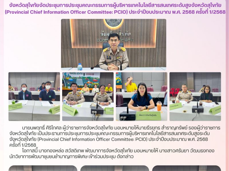 จังหวัดสุโขทัยจัดประชุมการประชุมคณะกรรมการผู้บริหารเทคโนโลยีสารสนเทศระดับสูงระดับจังหวัดสุโขทัย (Provincial Chief Information Officer Committee: PCIO) ประจำปีงบประมาณ พ.ศ. 2568 ครั้งที่ 1/2568